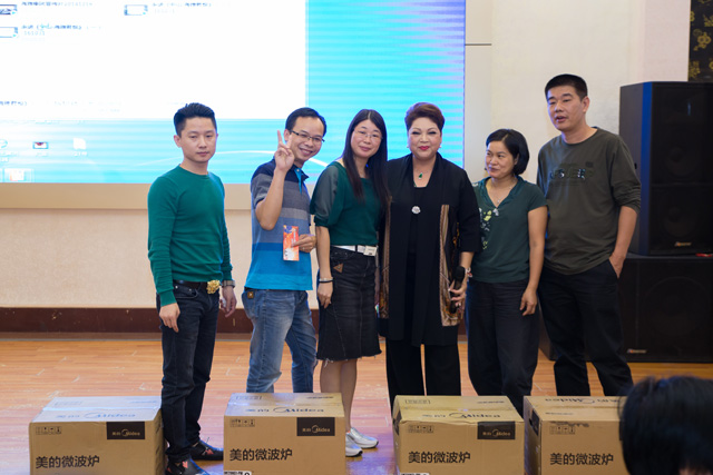 肥妈一上台就获得了现场观众的热烈鼓掌欢迎,一首脍炙人口的《万水千山总是情》带动起全场大合唱,也吸引了大批业主用手机围观和拍摄。几曲劲歌热舞之后,肥妈与业主们分享了她的房产投资心得,并表示自己也是海雅君悦的业主,不仅向身边朋友力推,也欢迎大家与她做邻居、搓麻将,共享美好花园。现场业主一边享用美味的午餐,一边还参与了激动人心的抽奖,肥妈为幸运业主送出了微波炉、电饭煲、荣耀手环、充电宝等一波又一波缤纷大奖,掀起阵阵气氛高潮。